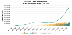 Figure 1 California Credit Bank: CARB’s published data showed the first quarterly deficit in many years. Because LCFS reporting lags by approximately seven months, Q3 represents the first observable impact of the 2025 step change –CARB